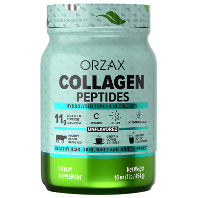 Orzax collagen peptides содержит высококачественные гидролизованные коллагеновые пептиды типа I и III, полученные из крупного рогатого скота, выращиваемого на траве и пастбищах, а так же является источником дополнительных витаминов и аминокислот улучшающих усвоение коллагена, такие как: витамин С, биотин и т.д.