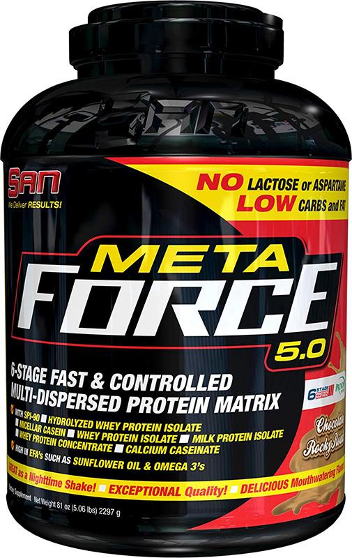 Многокомпонентный протеин Meta Force от компании SAN – это продукт, в основу которого положена 6-ступенчатая мульти-дисперсная белковая матрица, состоящая из таких источников протеина, как гидролизованный изолят сывороточного белка, SPI-90, микрофильтрованный концентрат сывороточного протеина, мицеллярный казеин, изолят сывороточного протеина, изолят и концентрат молочного протеина, а также казеинат кальция. Особенностью данного продукта заключается в высоком содержании незаменимых жирных кислот, источниками которых служат масло подсолнуха и омега-3.