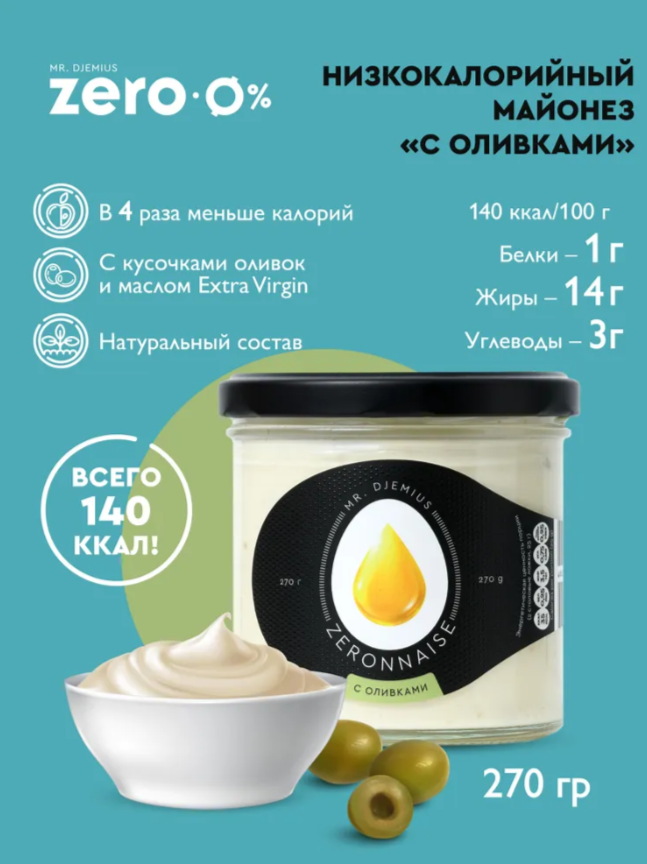 Вода, масло соевое, загуститель крахмал картофельный, оливки, подсластитель эритрит, масло оливковое, соль, горчичный порошок, яичный желток, уксус натуральный, загуститель крахмал кукурузный, загуститель камедь гуаровая, регулятор кислотности лимонная кислота, консервант сорбиновая кислота, экстракт черного перца, натуральный краситель B-каротин. Содержит подсластитель. При чрезмерном употреблении может оказывать слабительное действие. На предприятии используется арахис, горчица, сельдерей, кунжут, соя, злаки, орехи, молоко, яйца, рыба и продукты их переработки. Противопоказания: индивидуальная непереносимость ингредиентов продукта.